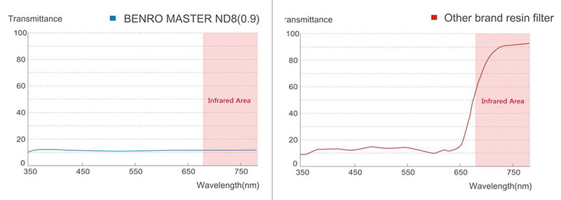 Khuyết điểm nghiêm trọng của nhựa quang học là dễ gây ra sự sai màu, hình ảnh dễ bị ám đỏ mà khó có thể xử lý hậu kỳ. Biểu đồ cho thấy, kính lọc Benro Master cho phép ánh sáng truyền xuyên suốt đồng đều và không có sự sai sắc nào.