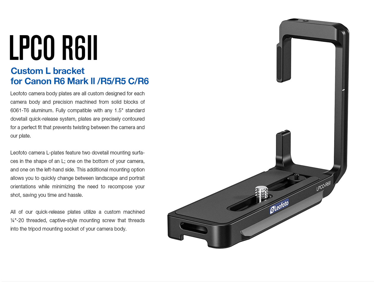 LPCO-R6II/R5/R5C/R6 là sản phẩm giá đỡ tùy chỉnh L bracket dành riêng cho máy ảnh Canon EOS R6II, R5, R5C, R6 của hãng Leofoto.