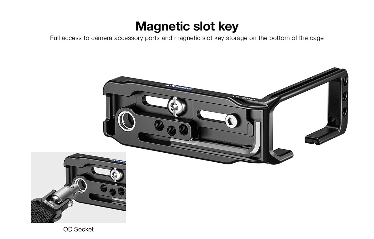 Leofoto LPCO-R6II/R5/R5C/R6 được thiết kế riêng để vừa khít với thân máy Canon EOS R6II, R5, R5C, R6, là một giá đỡ hình chữ L nhỏ gọn và nhẹ làm từ nhôm nguyên khối. Thiết kế mở của nó giúp bạn truy cập đầy đủ vào các nút điều khiển và cổng của máy ảnh, giảm trọng lượng trong khi vẫn duy trì độ cứng cáp, và cho phép chuyển đổi nhanh chóng giữa các hướng chụp dọc và ngang nhờ ngàm kiểu Arca. Các gờ chống xoay đảm bảo rằng body Canon EOS R6II, R5, R5C, R6 của bạn được gắn chắc chắn vào giá đỡ, và một loạt các lỗ ren 1/4"-20 cho phép gắn thêm phụ kiện nhỏ.