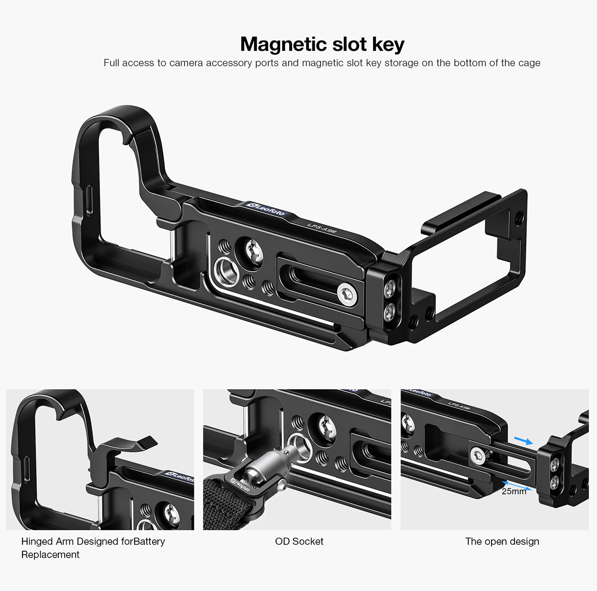 Leofoto LPS-A9III được thiết kế riêng tương thích với thân máy Sony A9 III, là một giá đỡ hình chữ L nhỏ gọn và nhẹ làm từ nhôm nguyên khối. Thiết kế mở của nó giúp bạn truy cập đầy đủ vào các nút điều khiển và cổng của máy ảnh, giảm trọng lượng trong khi vẫn duy trì độ cứng cáp, và cho phép chuyển đổi nhanh chóng giữa các hướng chụp dọc và ngang nhờ ngàm kiểu Arca. Các gờ chống xoay đảm bảo rằng body Sony A9 III của bạn được gắn chắc chắn vào giá đỡ, và một loạt các lỗ ren 1/4"-20 cho phép gắn thêm phụ kiện nhỏ.