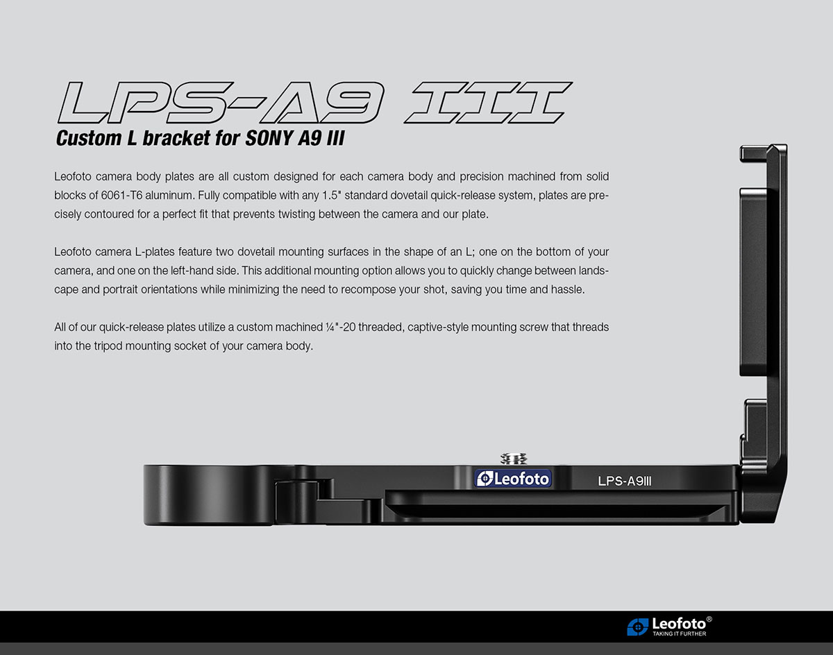 LPS-A9III là giá đỡ tùy chỉnh L-bracket dành riêng cho máy ảnh Sony A9 III của hãng Leofoto.