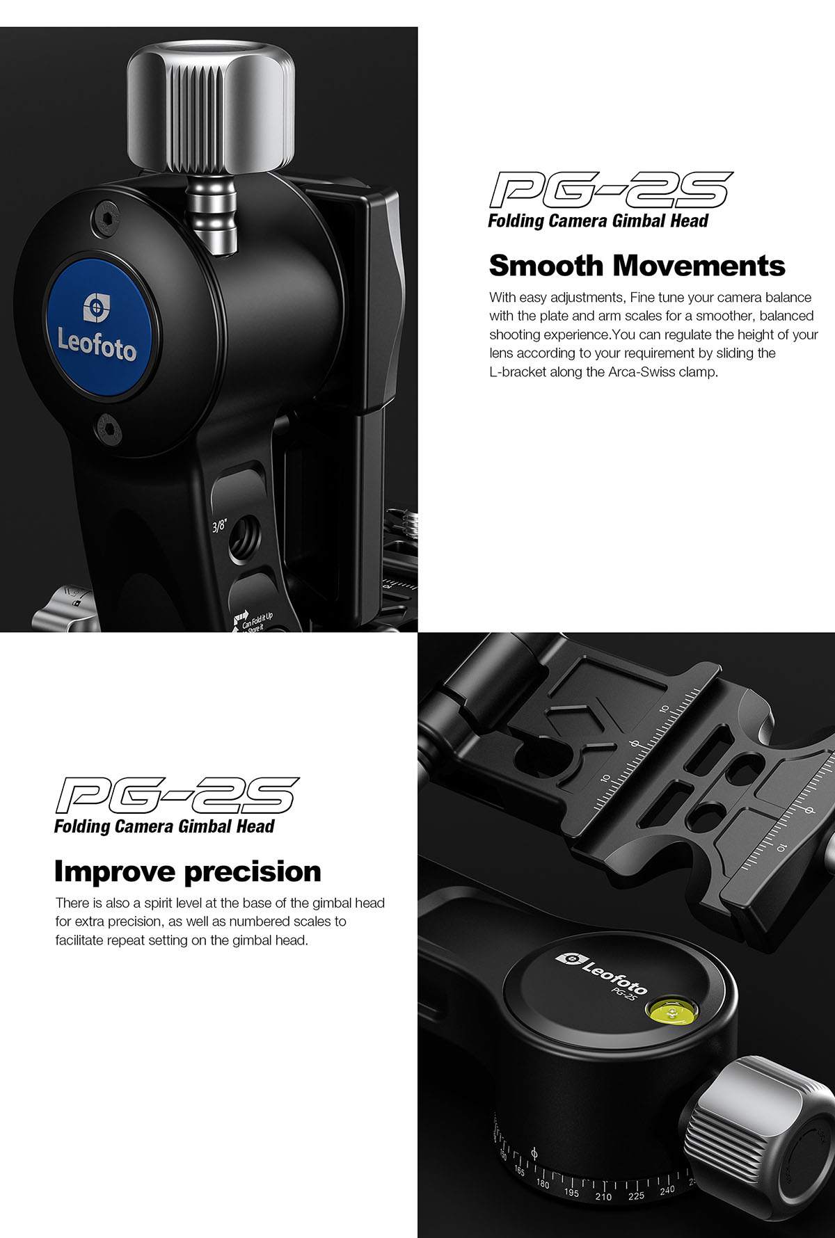 PG-2S có chiều cao 190mm, đường kính cơ sở 49mm và sử dụng chuẩn ốc phổ biến 3/8", giúp dễ dàng tương thích với hầu hết tripod chuyên nghiệp trên thị trường. Thiết kế công thái học cùng các núm khóa kim loại được gia công chính xác giúp thao tác điều chỉnh mượt mà, nhanh chóng và chính xác. Với khả năng cân bằng linh hoạt và hiệu suất quay mượt mà, Leofoto PG-2S là lựa chọn tối ưu để chụp ảnh ở tốc độ cao hoặc theo dõi đối tượng chuyển động liên tục.