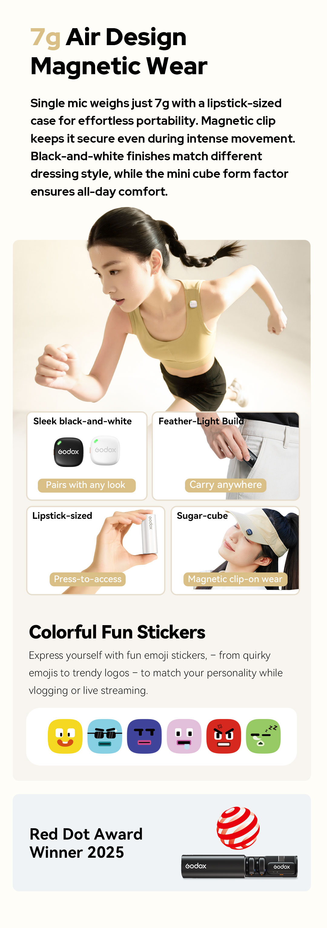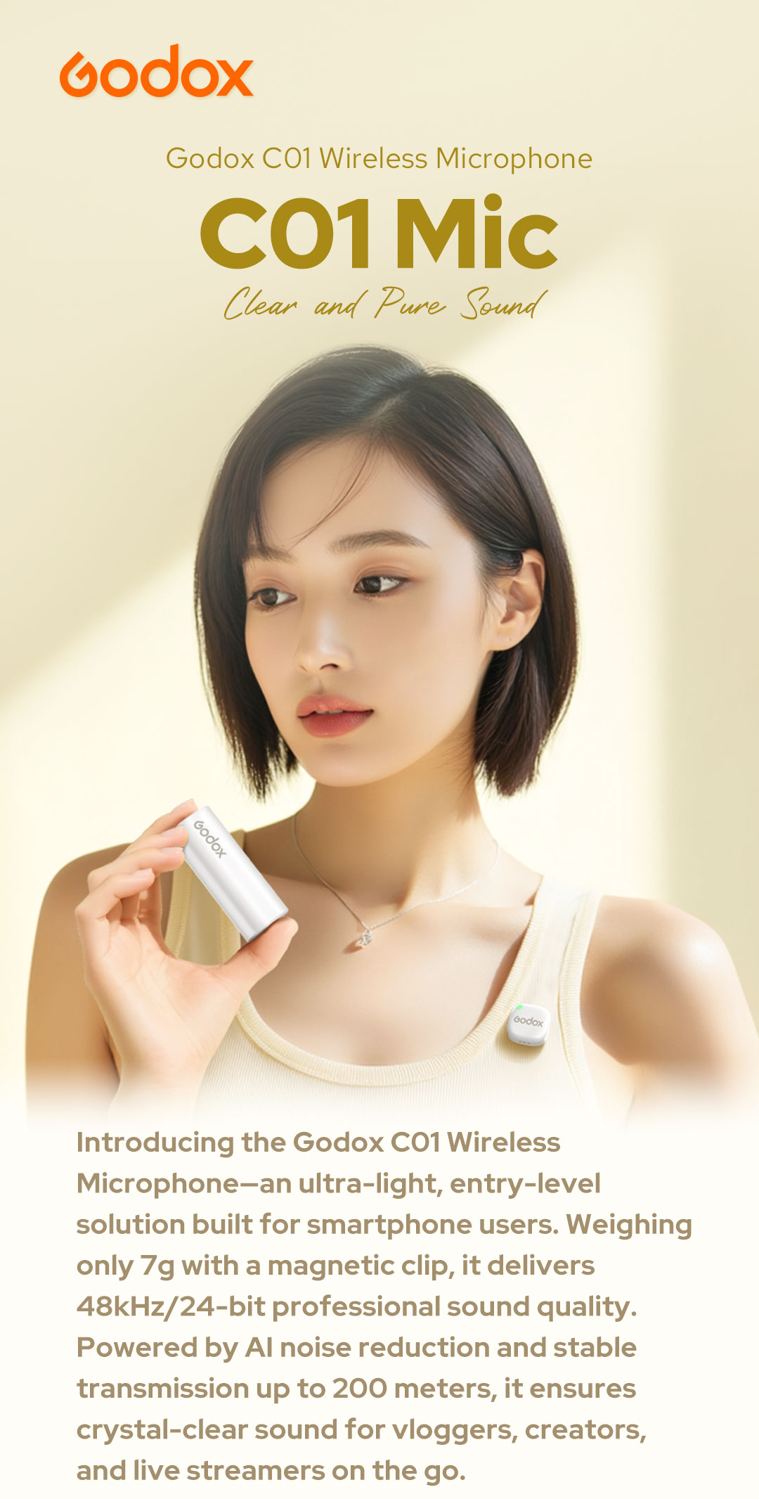 Với trọng lượng của bộ phát (Transmitter) chỉ nặng đúng 7g, Godox C01 mang đến trải nghiệm đeo hoàn toàn vô hình ("imperceptible wear"). Đi kèm với nam châm từ tính mạnh mẽ, bạn có thể dễ dàng gắn và giấu micro vào bên trong hoặc bên ngoài trang phục một cách tinh tế mà không làm hỏng form áo.
