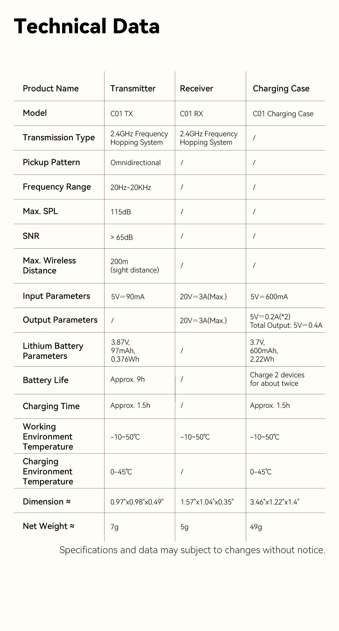 | Trọng lượng | Bộ phát: 7g Bộ thu: 5g Hộp sạc: 49g |
