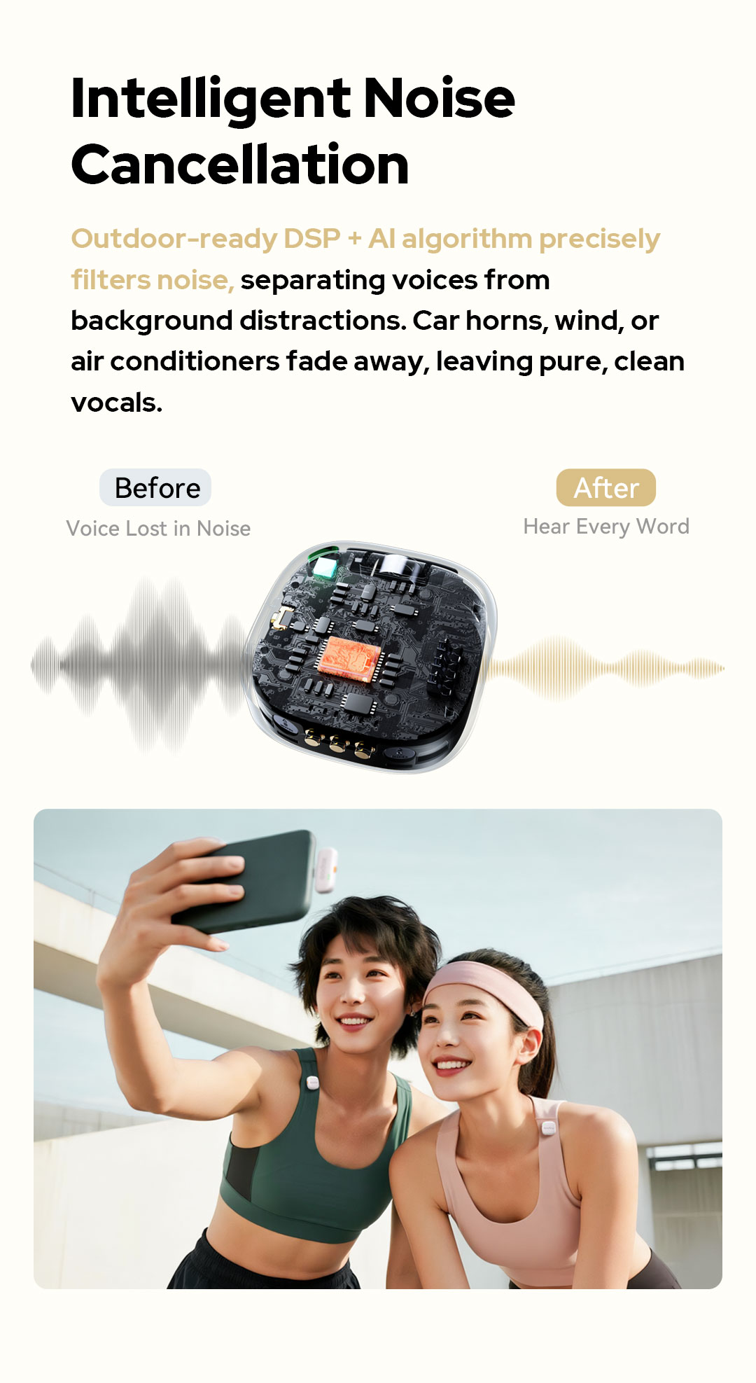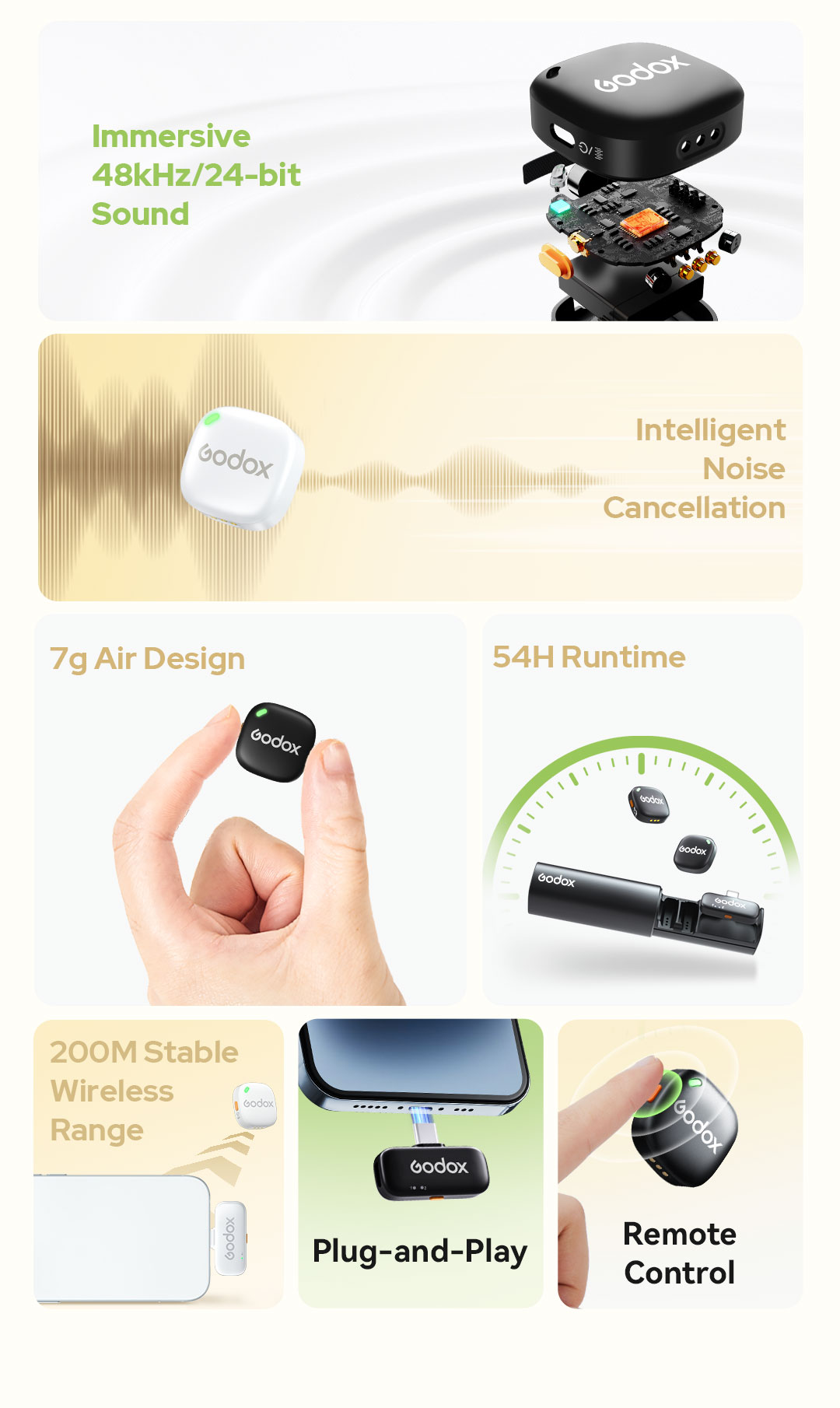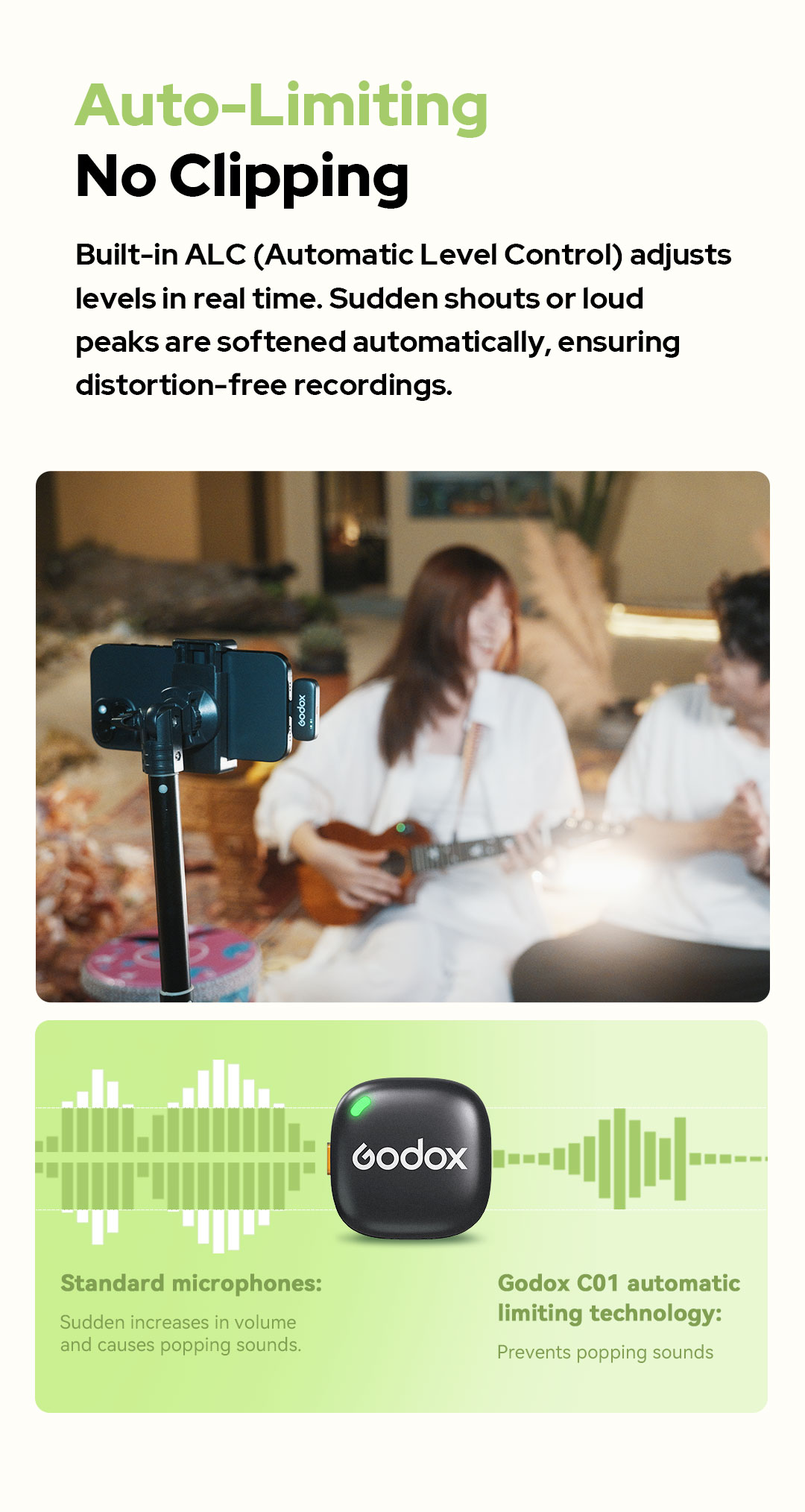 Godox C01 sử dụng các thuật toán DSP và AI tiên tiến để lọc bỏ tiếng ồn xung quanh. Chỉ với một thao tác bấm nút đơn giản (nút màu cam trên thân mic), tính năng giảm ồn sẽ được kích hoạt, giúp giọng nói của bạn luôn nổi bật và sắc nét ngay cả khi đang quay phim ngoài đường phố hay những môi trường ồn ào.