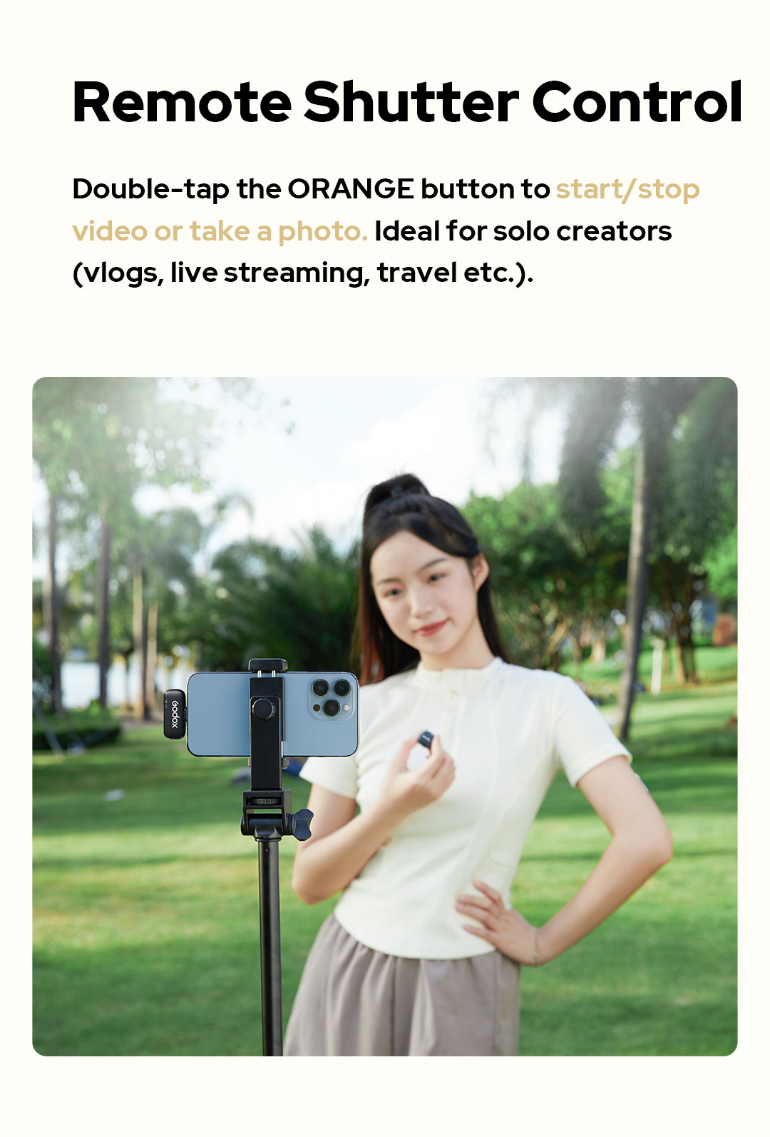 Nhấn double-tap vào nút ORANGE để Phát/Dừng quay video hoặc chụp ảnh. Lý tưởng cho nhà sáng tạo nội dung độc lập (vlogs, live streaming, du lịch,..)