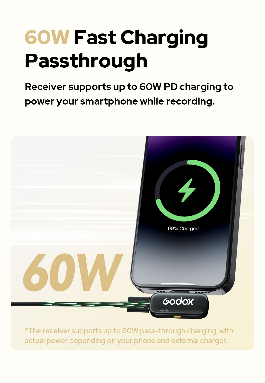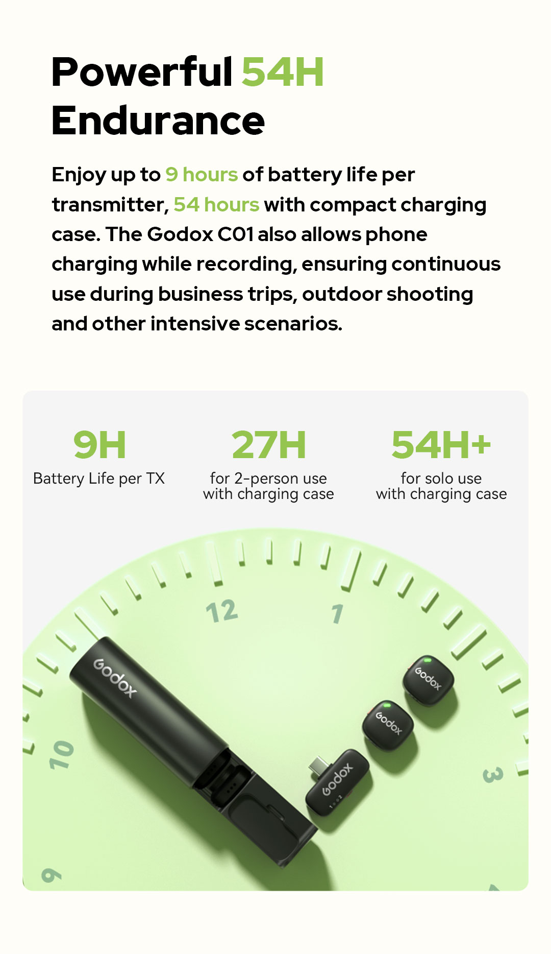 Bên cạnh chất lượng âm thanh, Godox C01 còn ghi điểm với khả năng hoạt động bền bỉ và vô cùng tiện dụng (Plug-and-play). Một bộ phát có thể hoạt động liên tục 9 giờ và kéo dài lên đến 27 giờ (hoặc 54 giờ nếu dùng luân phiên 1 mic) khi kết hợp với hộp sạc đi kèm. Đặc biệt, bộ thu (receiver) cắm trực tiếp vào điện thoại còn hỗ trợ cổng sạc xuyên thấu (pass-through) công suất lên tới 60W, cho phép bạn vừa ghi hình vừa sạc điện thoại mà không lo cạn pin. Với khoảng cách truyền sóng ổn định 200m và tính năng kiểm soát mức âm thanh tự động (ALC) chống méo tiếng, Godox C01 Kit 2 là thiết bị thu âm hoàn hảo cho mọi nhu cầu quay chụp di động.