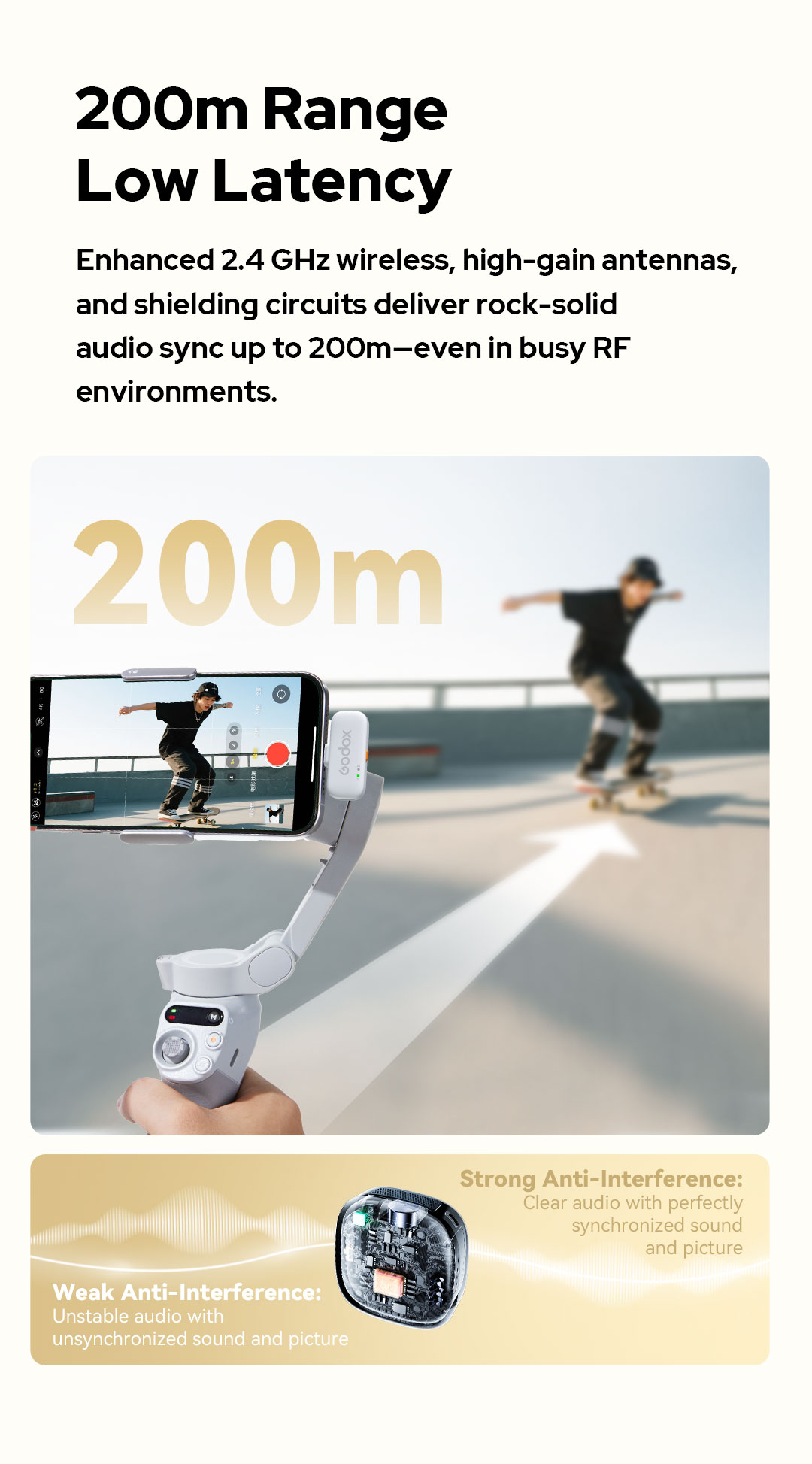 Sử dụng công nghệ nhảy tần không dây 2.4GHz (Frequency Hopping System), C01 đảm bảo tín hiệu âm thanh được truyền đi ổn định, chống nhiễu tốt và độ trễ cực thấp trong phạm vi hoạt động lên tới 200 mét (ở điều kiện không có vật cản).