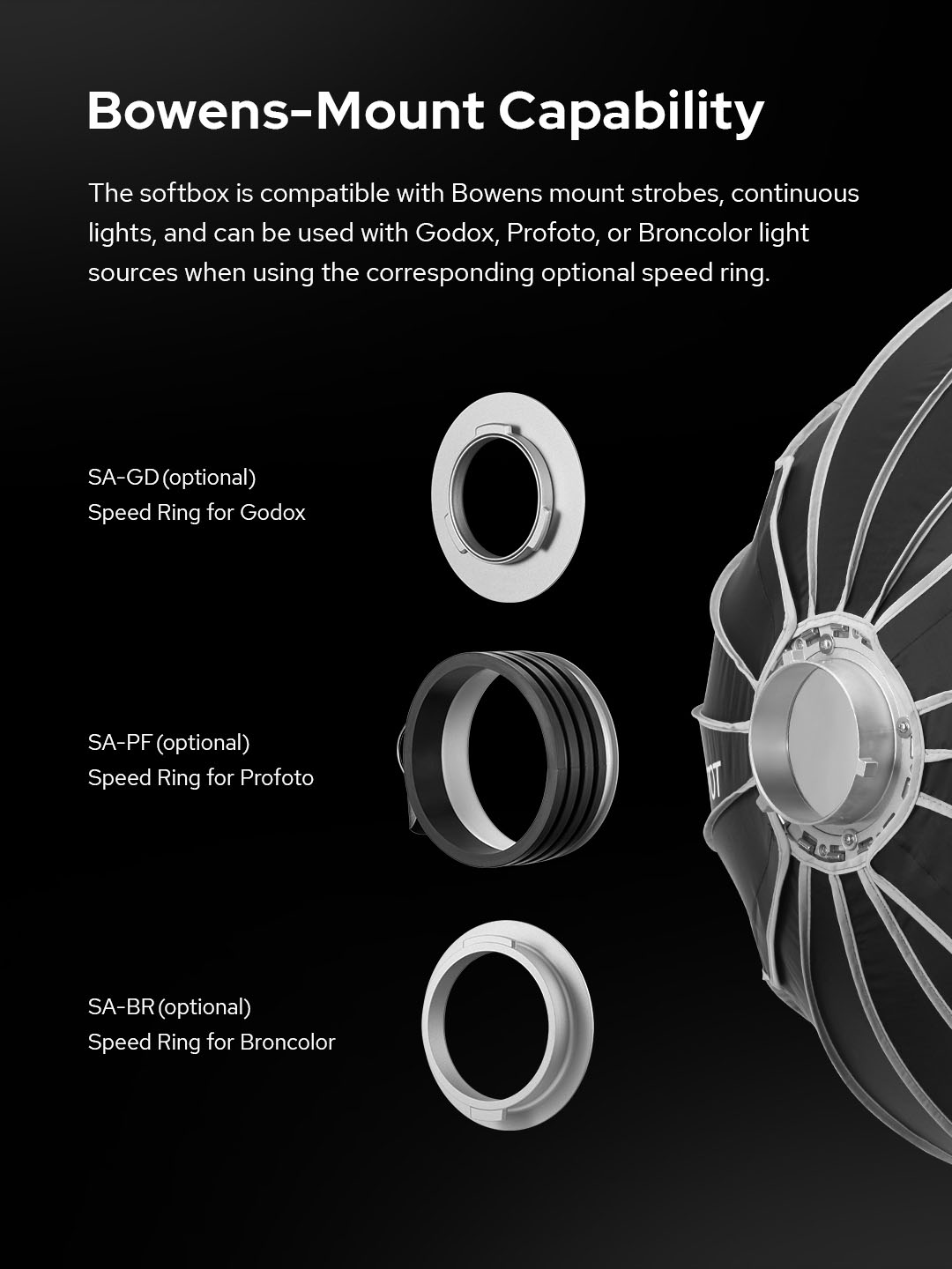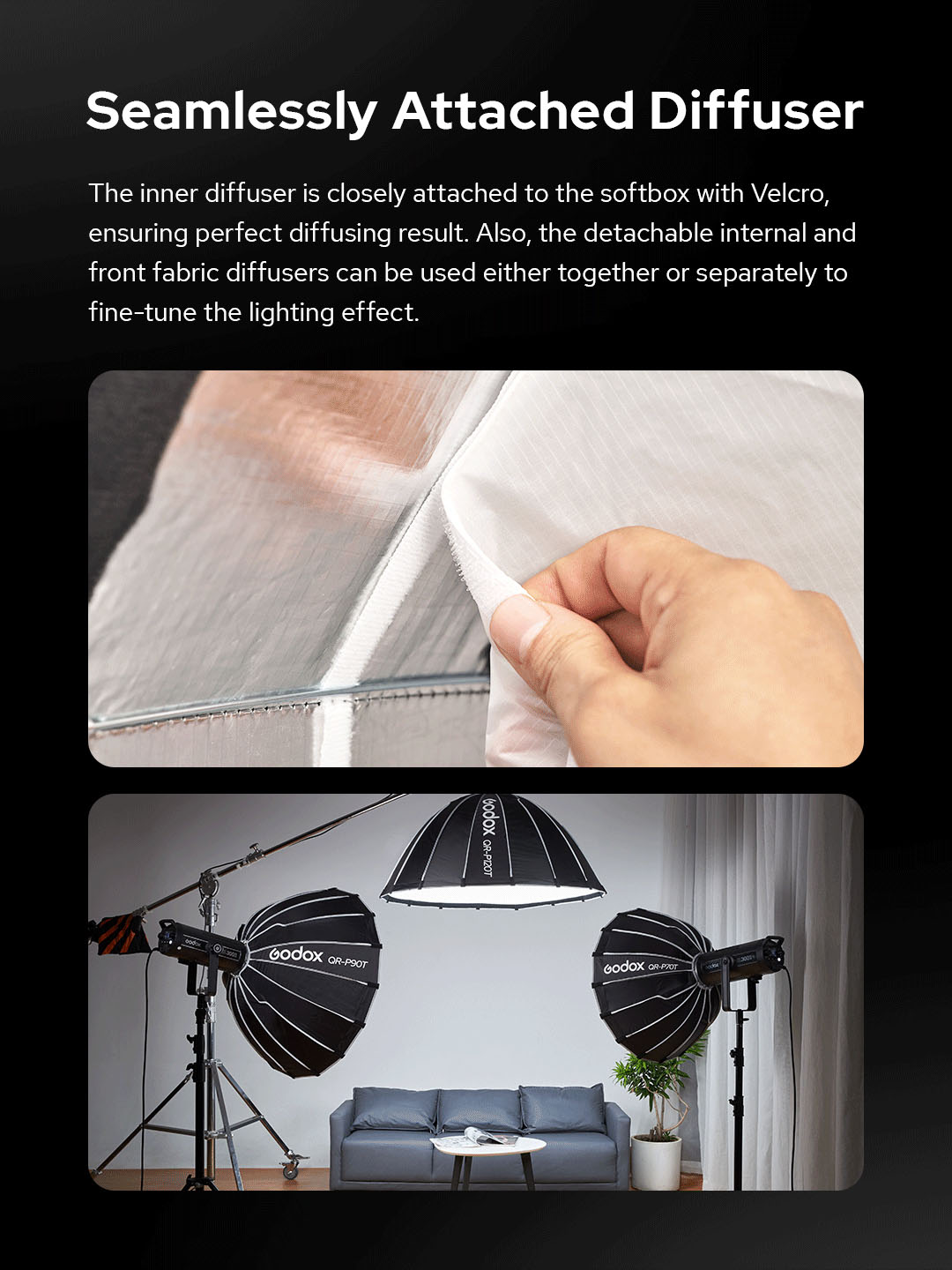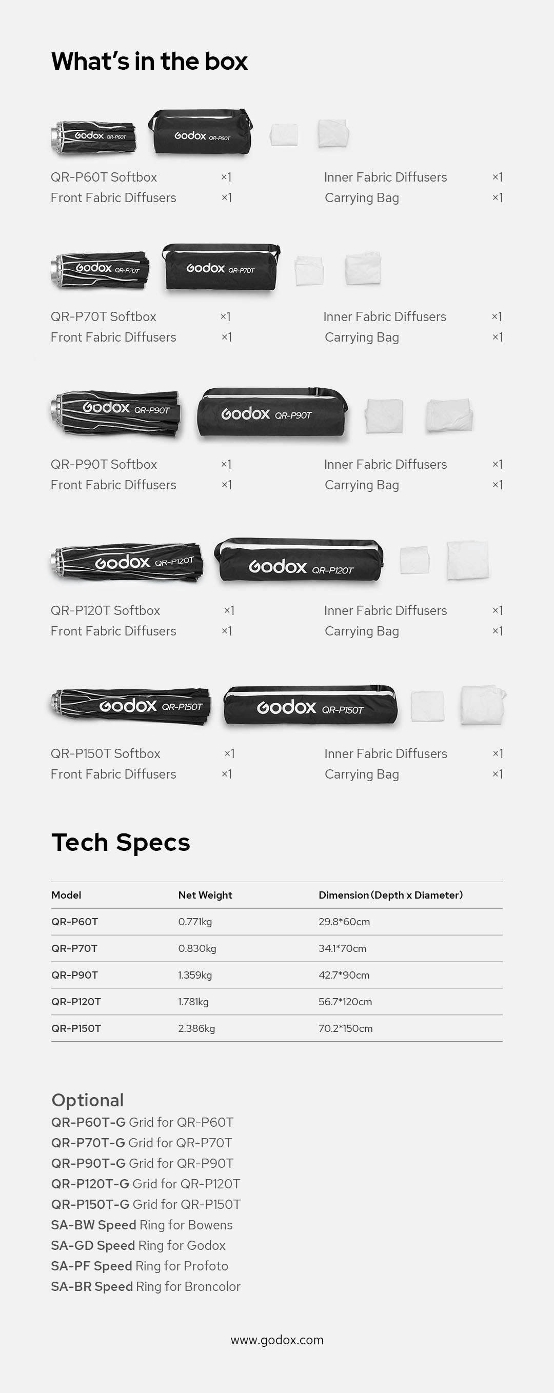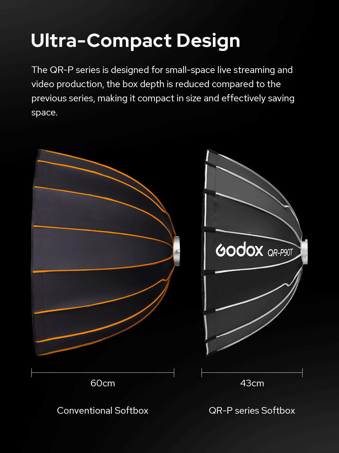 Godox QR-P là dòng Parapolic Softbox mới của hãng Godox. Với thiết kế gọn nhẹ hơn so với các sản phẩm tiền nhiệm trong cùng dòng, QR-P60T / 70T / 90T / 120T / 150T được bán kèm cùng lưới grid (P60TG, P70TG, P90TG, P120TG, P150TG). Được thiết kế như một hộp làm dịu sáng dành cho livestream và quay video trong không gian nhỏ, hệ thống tháo lắp nhanh giúp đơn giản hóa việc lắp đặt và tháo gọn. Thiết kế khuếch tán bên trong, được kết nối chặt chẽ bằng Velcro, đảm bảo hiệu quả khuếch tán hoàn hảo. Có sẵn với 5 đường kính (60, 70, 90, 120, 150cm), đây là thiết bị lý tưởng cho các buổi chụp ảnh, quay video và livestream.