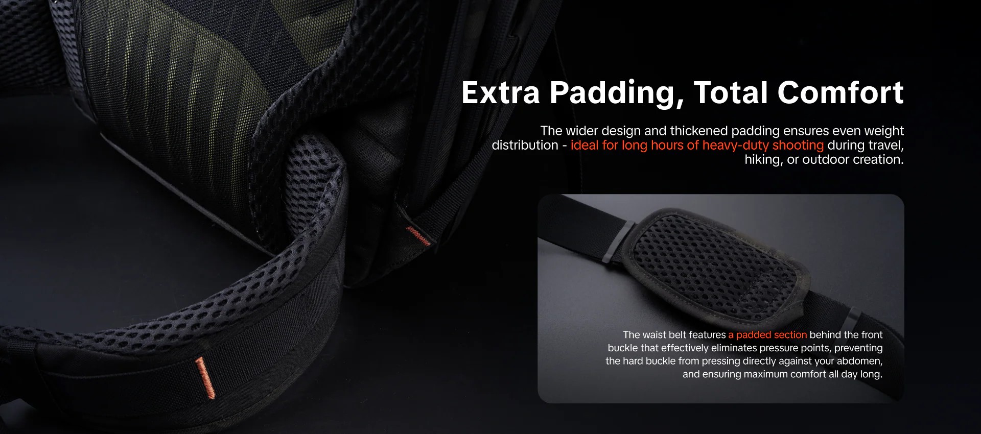 PGYTECH OneMo Photography Waist Belt là Đai Đeo Bụng dùng cho balo OneMo TAC cho các nhiếp ảnh gia chuyên nghiệp. Được chế tạo từ vải polyester cường độ cao siêu bền, sản phẩm có khả năng chống mài mòn và biến dạng cực tốt. Thiết kế của đai chú trọng tối đa vào trải nghiệm người dùng với phần đệm dày và rộng giúp phân bổ trọng lượng đồng đều lên vùng eo, đồng thời tích hợp miếng đệm mềm phía sau khóa cài để loại bỏ hoàn toàn các điểm áp lực lên vùng bụng, mang lại cảm giác dễ chịu ngay cả khi đeo trong thời gian dài.