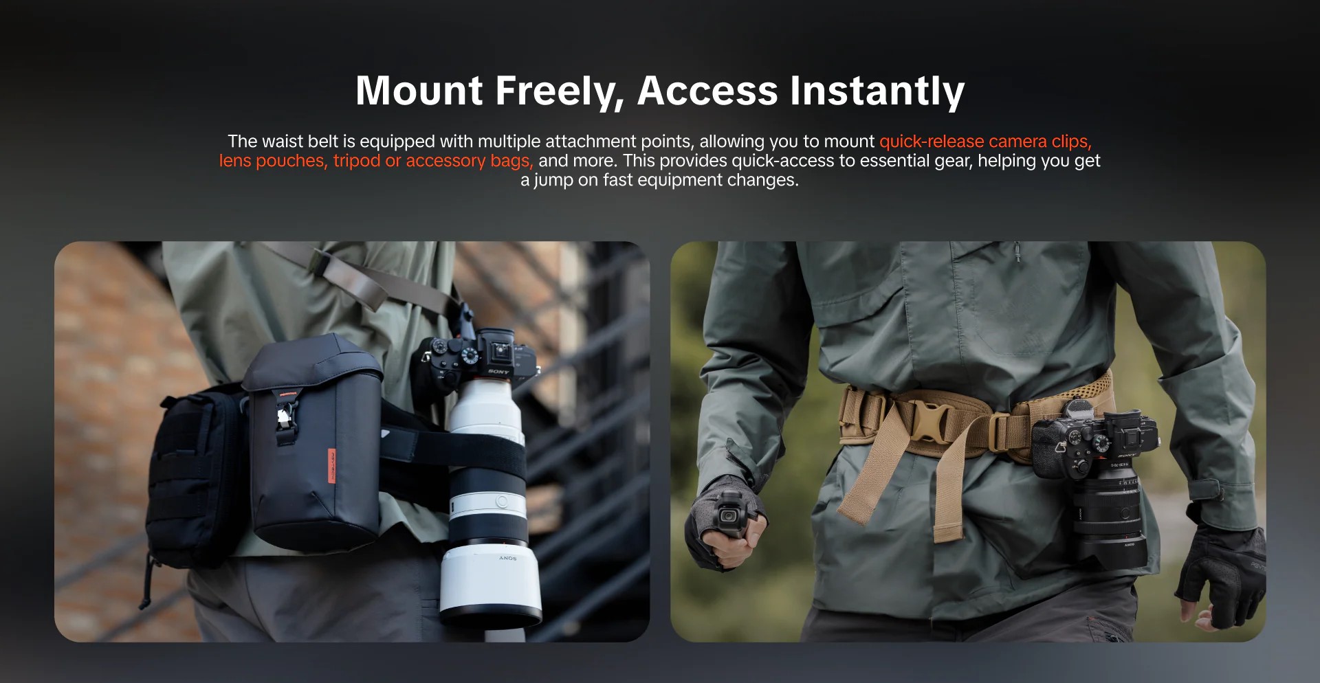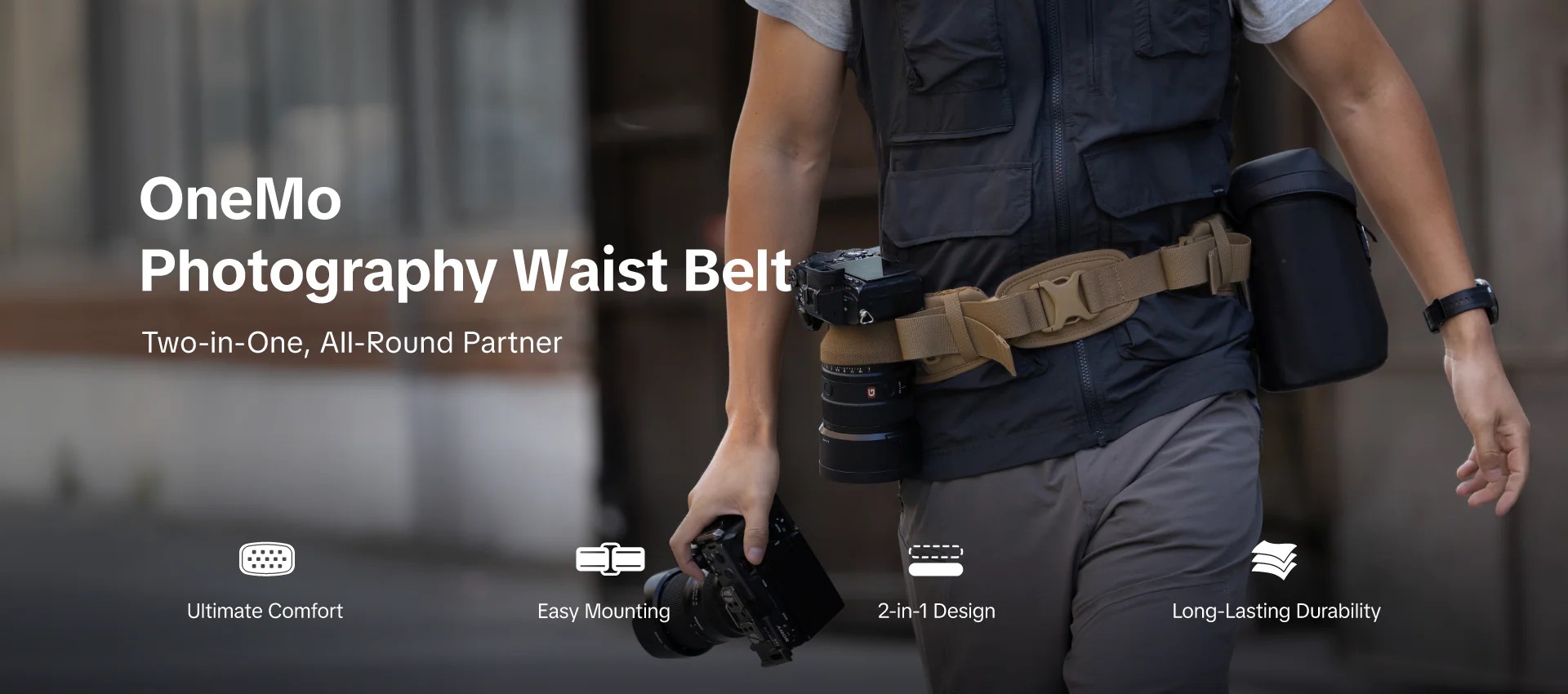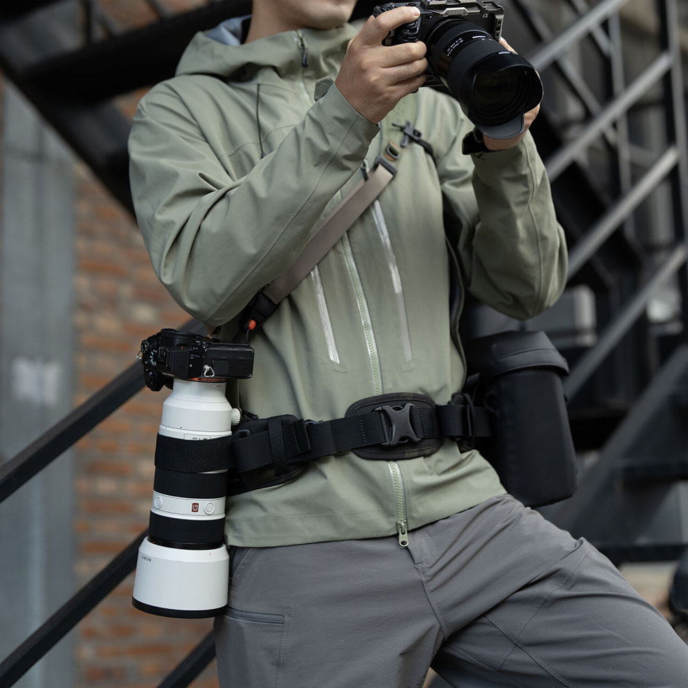 Về mặt công năng, chiếc đai này sở hữu tính đa dụng vượt trội với thiết kế "hai trong một": bạn có thể sử dụng nó như một đai đeo độc lập cho các chuyến đi nhẹ nhàng hoặc gắn kết hợp với ba lô OneMo để trợ lực. Đai được trang bị nhiều điểm gắn kết (attachment points) cho phép người dùng linh hoạt lắp đặt các phụ kiện như kẹp máy ảnh tháo lắp nhanh (quick-release clip), túi đựng ống kính hay túi đựng chân máy. Đặc biệt, sản phẩm còn có dây neo máy ảnh (camera tether) ở bên phải giúp cố định thiết bị, ngăn chặn tình trạng rung lắc không mong muốn khi di chuyển, đảm bảo an toàn tối đa cho thiết bị của bạn.