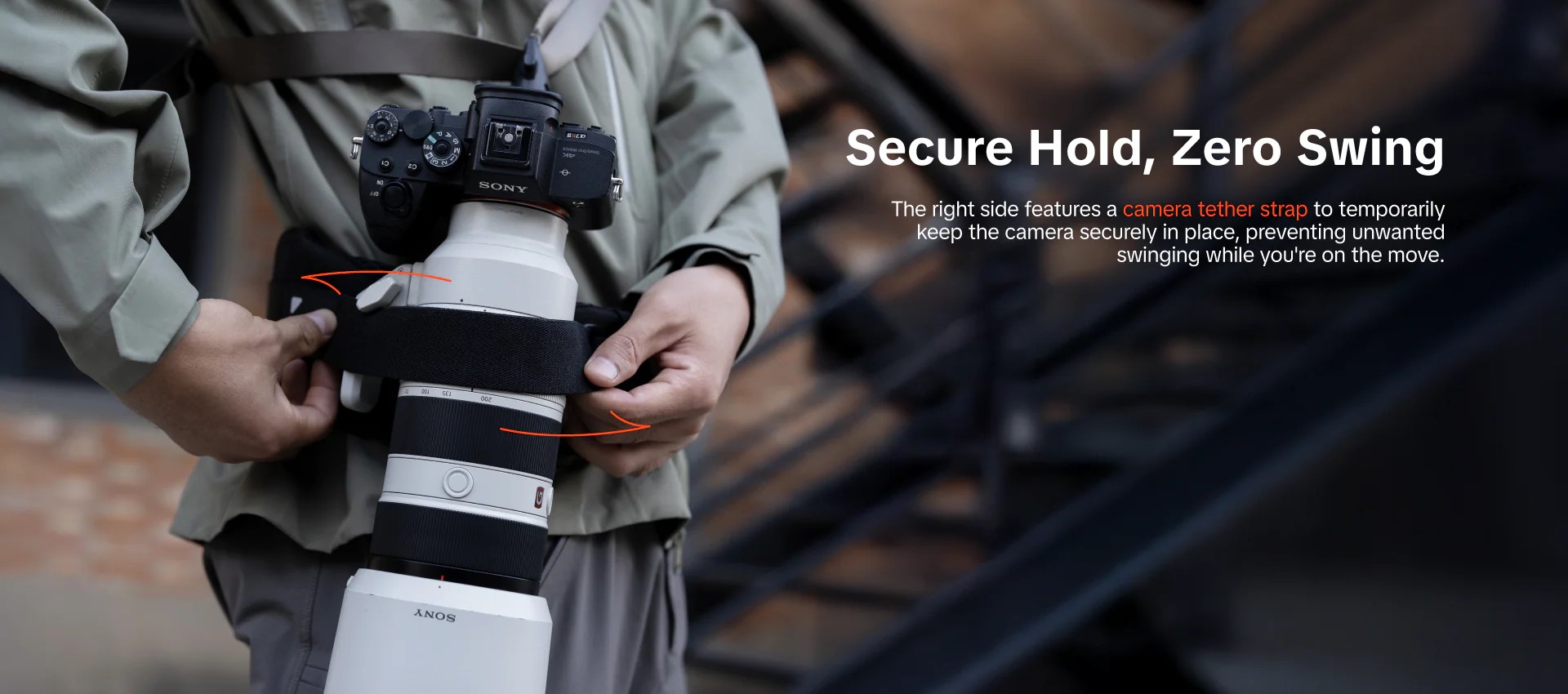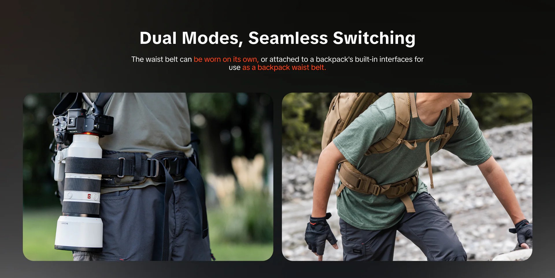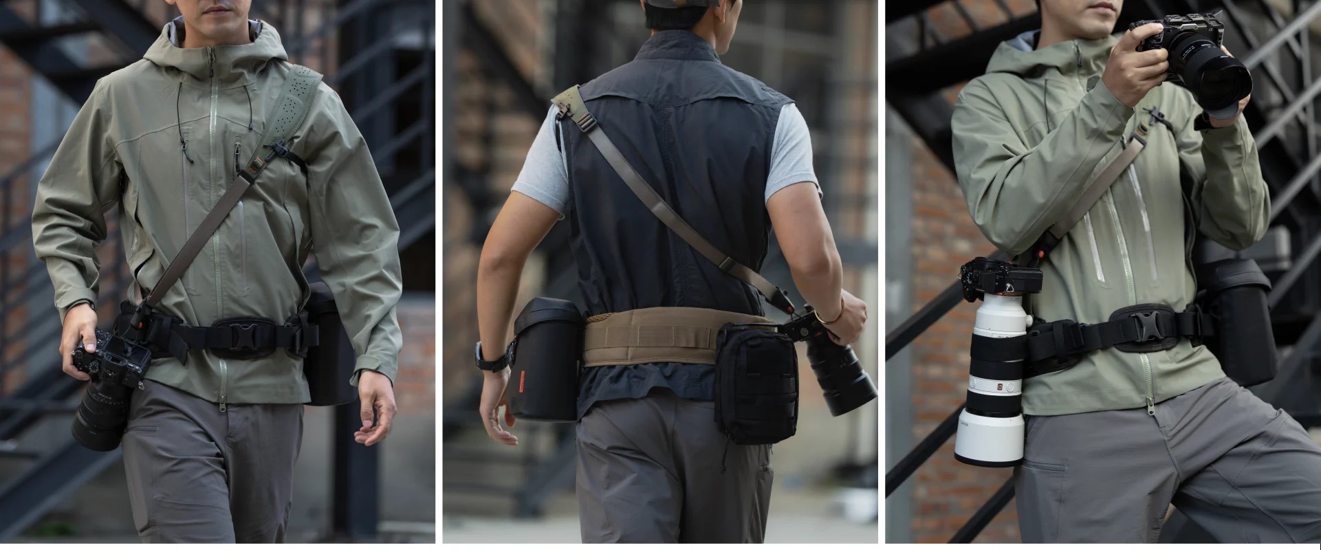 Về mặt công năng, chiếc đai này sở hữu tính đa dụng vượt trội với thiết kế "hai trong một": bạn có thể sử dụng nó như một đai đeo độc lập cho các chuyến đi nhẹ nhàng hoặc gắn kết hợp với ba lô OneMo để trợ lực. Đai được trang bị nhiều điểm gắn kết (attachment points) cho phép người dùng linh hoạt lắp đặt các phụ kiện như kẹp máy ảnh tháo lắp nhanh (quick-release clip), túi đựng ống kính hay túi đựng chân máy. Đặc biệt, sản phẩm còn có dây neo máy ảnh (camera tether) ở bên phải giúp cố định thiết bị, ngăn chặn tình trạng rung lắc không mong muốn khi di chuyển, đảm bảo an toàn tối đa cho thiết bị của bạn.