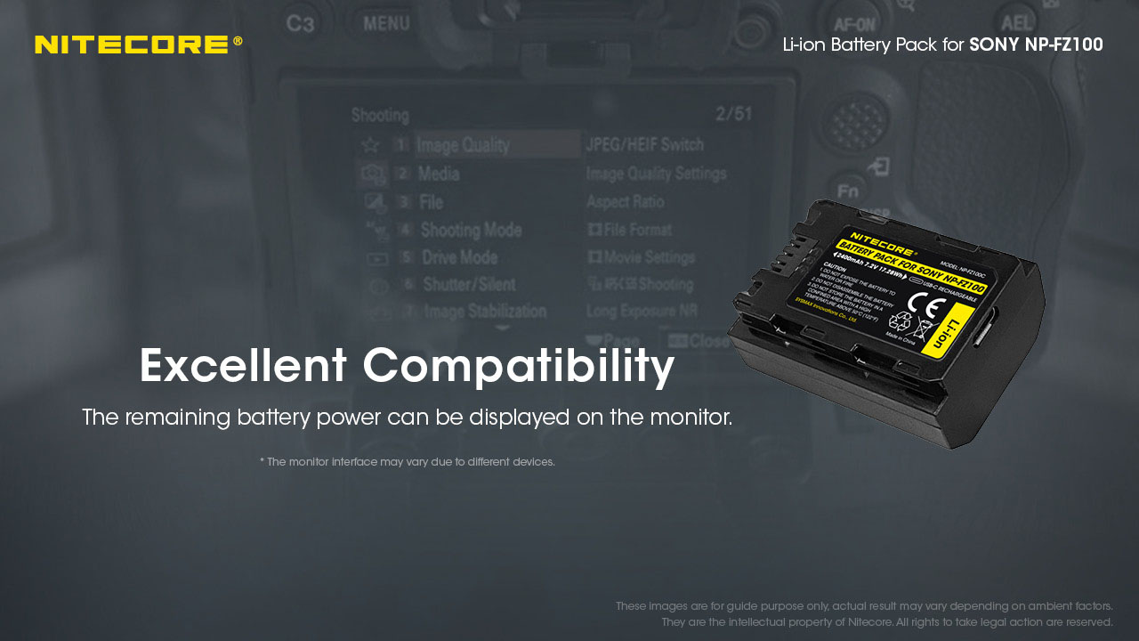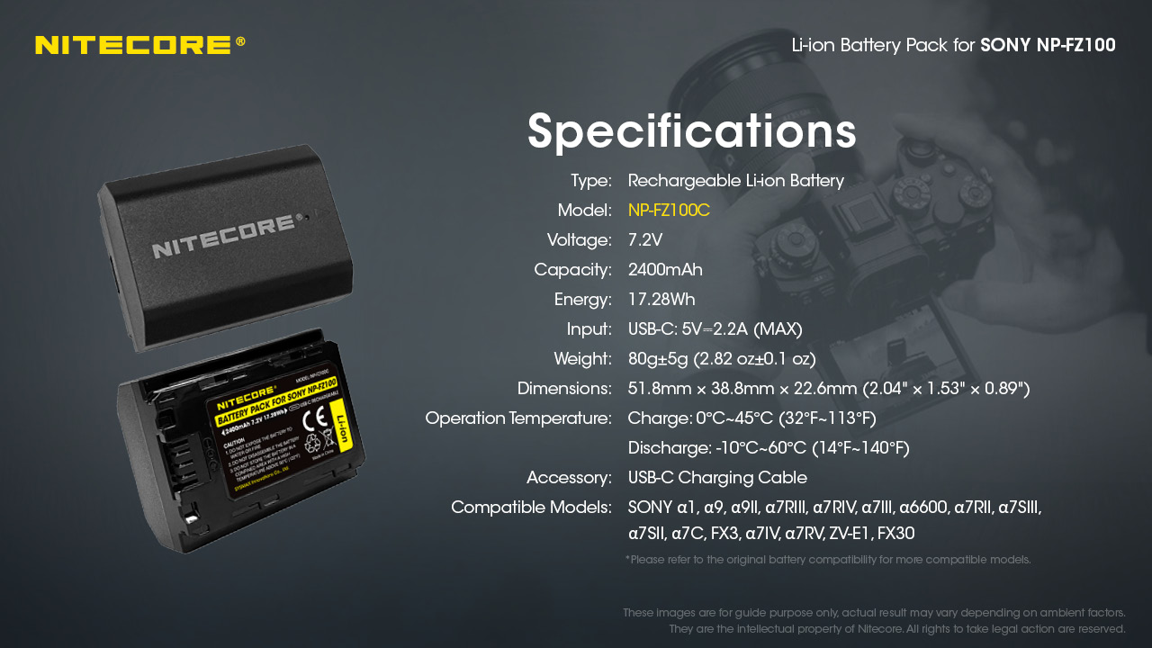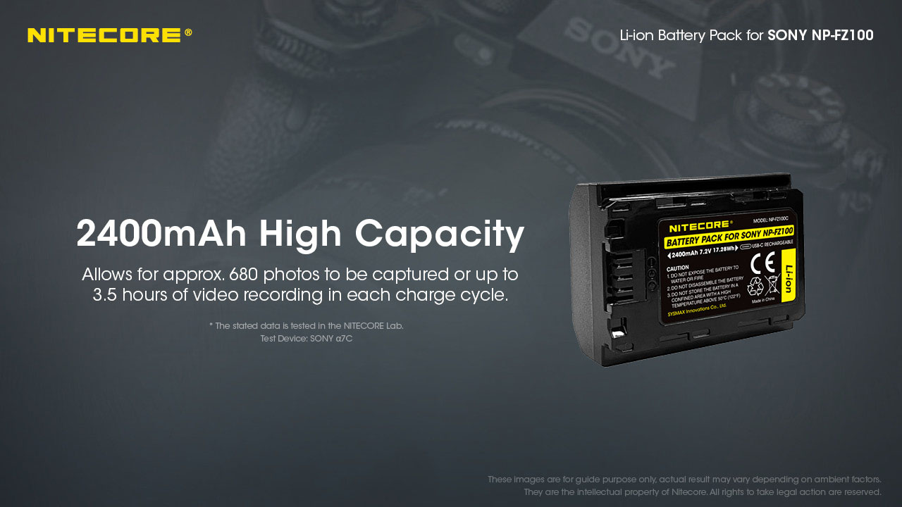Pin Nitecore NP-FZ100C là nguồn năng lượng đáng tin cậy cho máy ảnh Sony, với dung lượng 2400mAh. Tương thích với nhiều dòng máy Sony hàng đầu như α1, α9, α7RIV, và nhiều dòng khác. Pin có thể sạc lại qua cổng USB-C, mang lại sự thuận tiện và linh hoạt cho người sử dụng chuyên nghiệp và nghiệp dư. Đừng bỏ lỡ khoảnh khắc quan trọng với hiệu suất ổn định và độ tin cậy của pin NP-FZ100C.