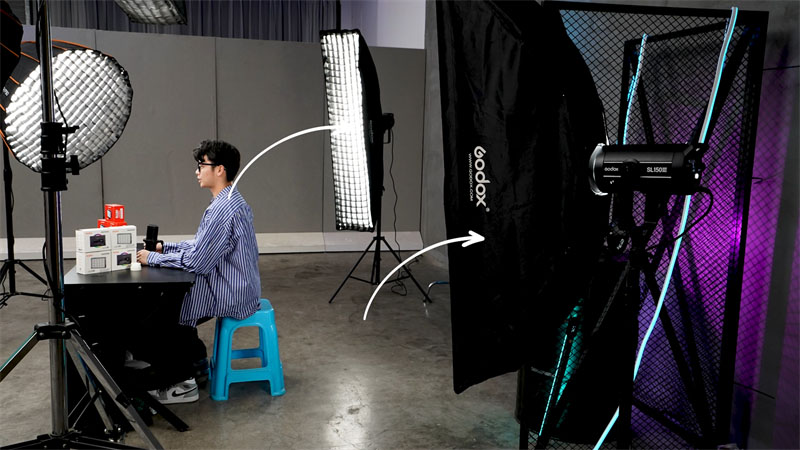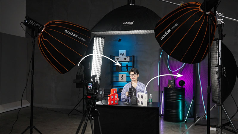 Để đảm bảo người livestream và sản phẩm trên bàn được chiếu sáng đầy đủ, Godox sử dụng bộ đèn Godox SL150III kết hợp với softbox SB-FW 35x160 đặt ở hai bên trái và phải. Ánh sáng mềm mại và đều này tạo nên hiệu ứng ba chiều, giúp khuôn mặt streamer rõ nét và sản phẩm được thể hiện chi tiết. Ngoài ra, đèn Godox SL200III với softbox tương tự được treo phía trên để làm ánh sáng bổ sung, tăng độ sáng và hạn chế bóng tối không mong muốn, giúp hình ảnh tổng thể cân bằng và chuyên nghiệp hơn.