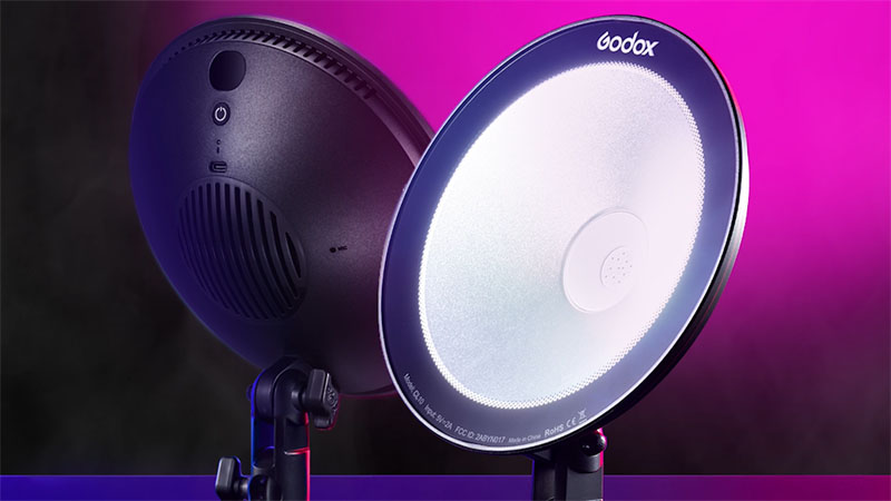 Đèn Godox CL10 được đặt ở bên phải với ánh sáng tím nhẹ nhàng.