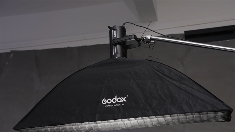 đèn Godox SL200III với softbox SB-FW 35x160 tương tự được treo phía trên.