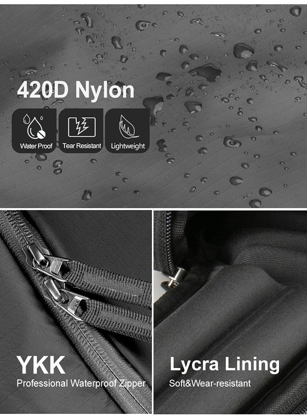 Sử dụng khóa kéo YKK nổi tiếng với độ bền cao, kết hợp với vải nylon 420D có khả năng chống nước và chống mài mòn. Bên trong được lót bằng vải Lycra mềm mại, giúp bảo vệ ống kính giá trị đồng thời giữ cho túi đựng bền đẹp, ít xuống cấp theo thời gian.