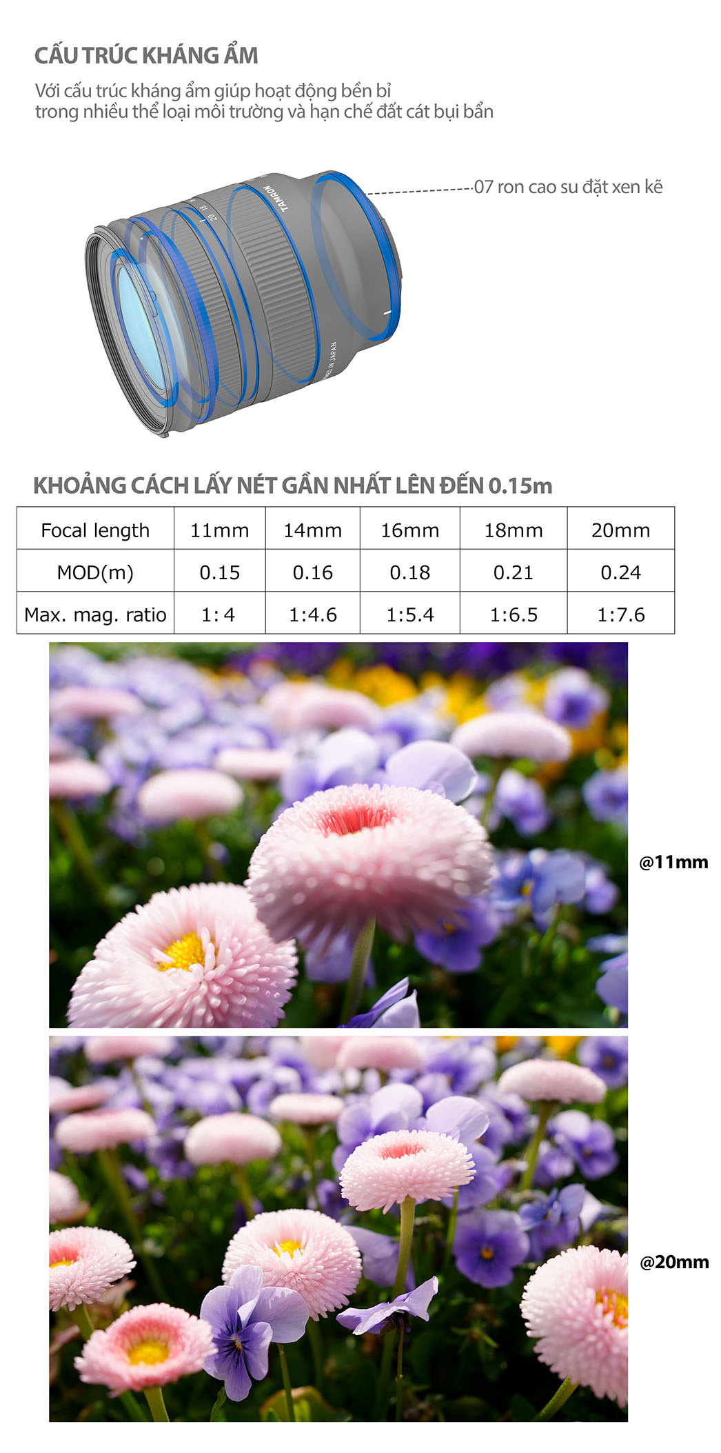 Ở tiêu cự góc siêu rộng 11mm, ống kính cho phép chụp cận cảnh đẹp mắt với MOD - khoảng cách lấy nét tối thiểu với chủ thể chỉ 0,15m (5,9 in) và tỉ lệ phóng đại tối đa lên đến 1:4. Tính năng này cho phép chụp macro góc rộng để tận dụng sự sáng tạo của hiệu ứng méo hình tự nhiên chỉ có ở các ống kính góc siêu rộng.