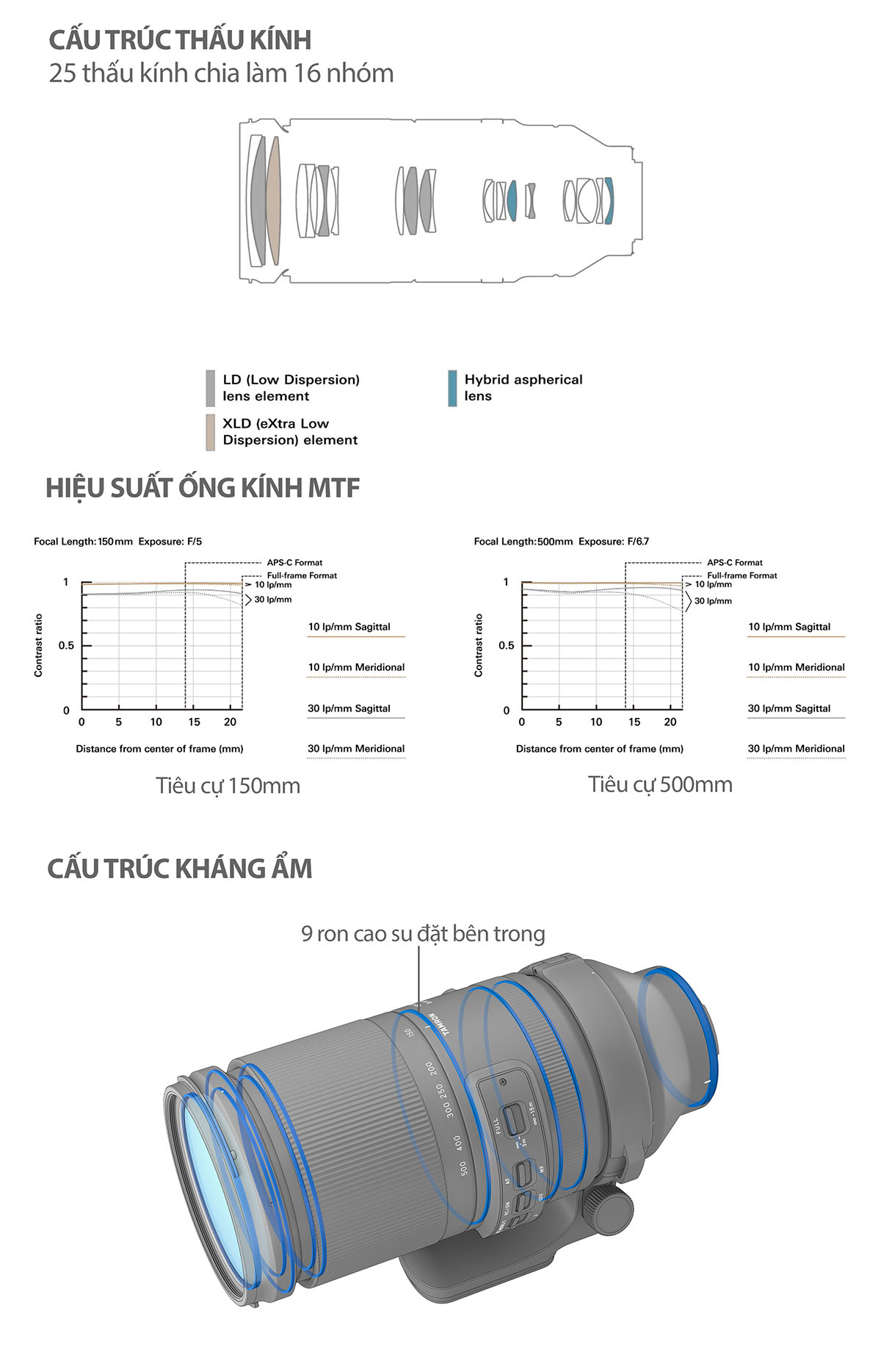 Cấu trúc quang học gồm 25 thấu kính chia vào 16 nhóm, trang bị các thấu kính chuyên biệt và thấu kính phi cầu lai nhằm kiểm soát quang sai sắc. Mỗi thấu kính phủ BBAR-G2 giảm lóa sáng và bóng mờ cho độ tương phản và chính xác màu cao. Động cơ lấy nét tuyến tính VXD (Voice-coil eXtreme-torque Drive) mang lại chuyển độ chính xác và tốc độ cực cao, đảm bảo hiệu năng phản hồi vượt trội. Khoảng cách lấy nét tối thiểu là 60cm tại đầu 150mm của dải zoom cho ảnh chụp cận cảnh sống động và góp phần vào tính hữu dụng ấn tượng của ống kính này.
