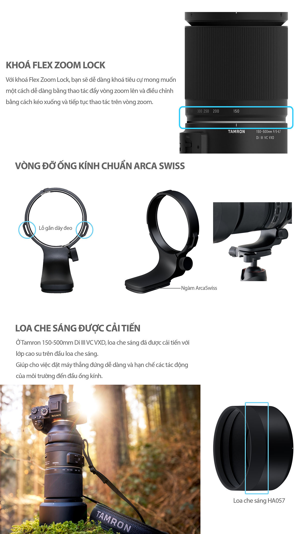 - Siêu tele fullframe nhỏ gọn - Tamron dừng lại ở mốc 500mm để đảm bảo được tính linh động nhỏ gọn nhất có thể cho các dòng máy ảnh không gương lật, chiều dài chỉ 212,3 mm, filter size 82mm.