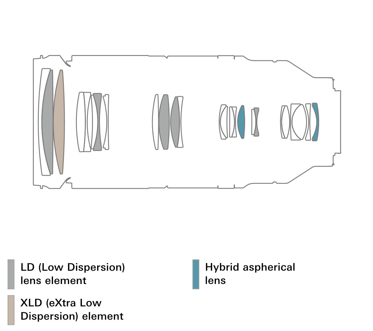 Các thấu kính XLD (eXtra Low Dispersion), LD (Low Dispersion) và GM (Glass-Molded Aspherical) giúp giảm mạnh các hiện tượng viền màu, quang sai sắc và méo hình xuyên suốt dải zoom nhằm cải thiện độ trong rõ và chính xác màu.