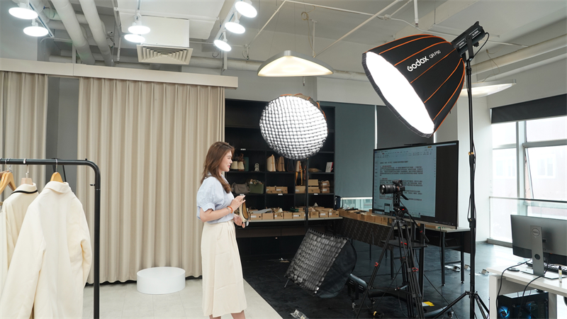 Đặt một đèn livestream SL150 III gắn kèm softbox có lưới SB-FW6090 tản sáng phía dưới trước của người livestream để bổ sung ánh sáng cho phần thân dưới, đồng thời hiển thị hiệu ứng ánh sáng trên sản phẩm giày dép và túi xách.