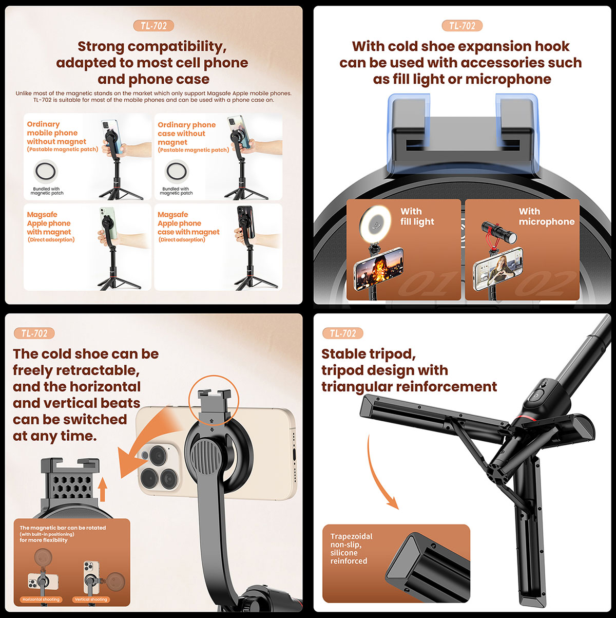 Fotopro TL-702 là một tripod giá đỡ điện thoại đa năng với thiết kế và nhiều tính năng hiện đại cho các nhu cầu quay chụp di động. Các tính năng nổi bật: