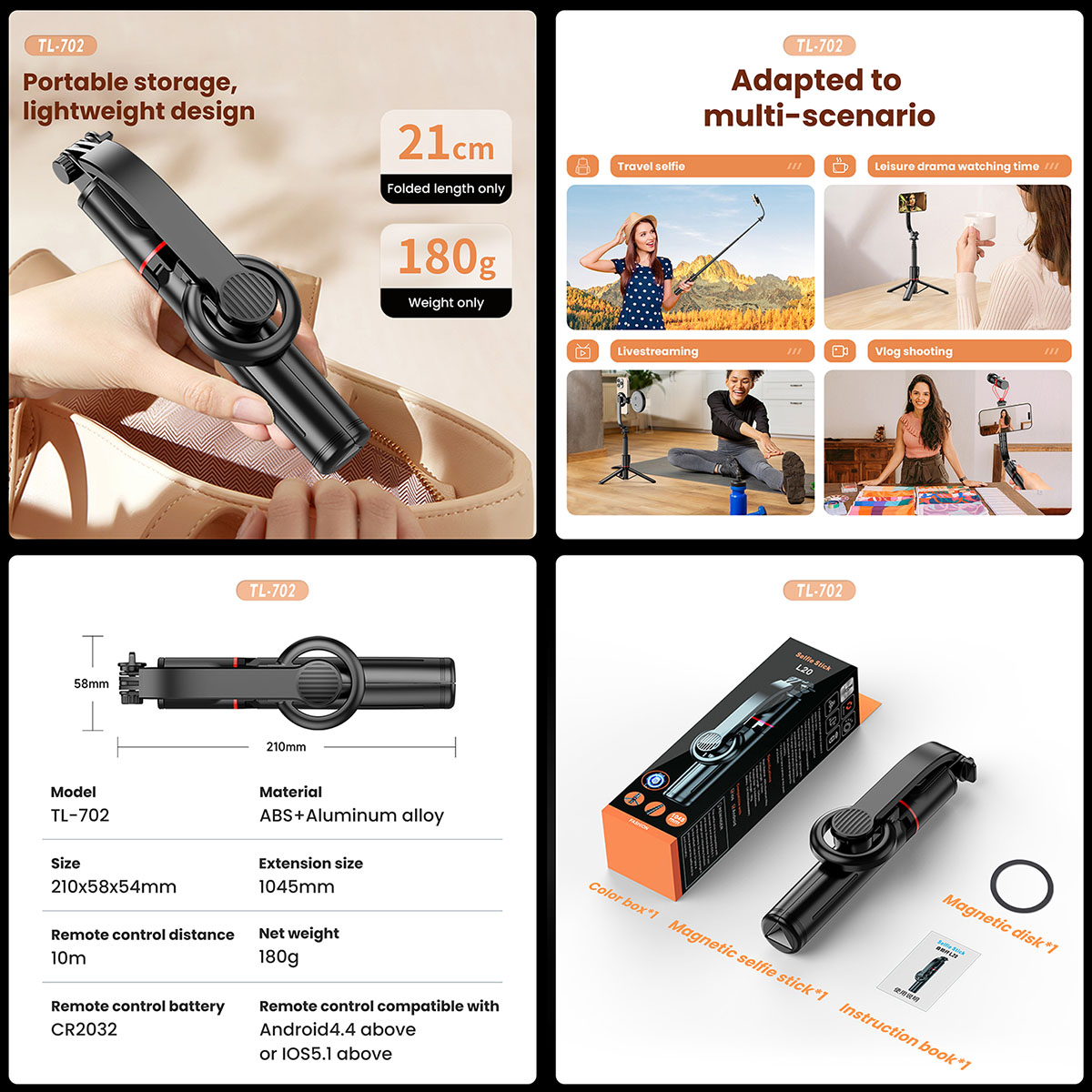 Bộ sản phẩm bao gồm: tripod TL-702, đế nam châm, sách hướng dẫn và hộp đựng. Đây là lựa chọn lý tưởng cho những ai cần một thiết bị quay chụp chuyên nghiệp, gọn nhẹ và tiện lợi.