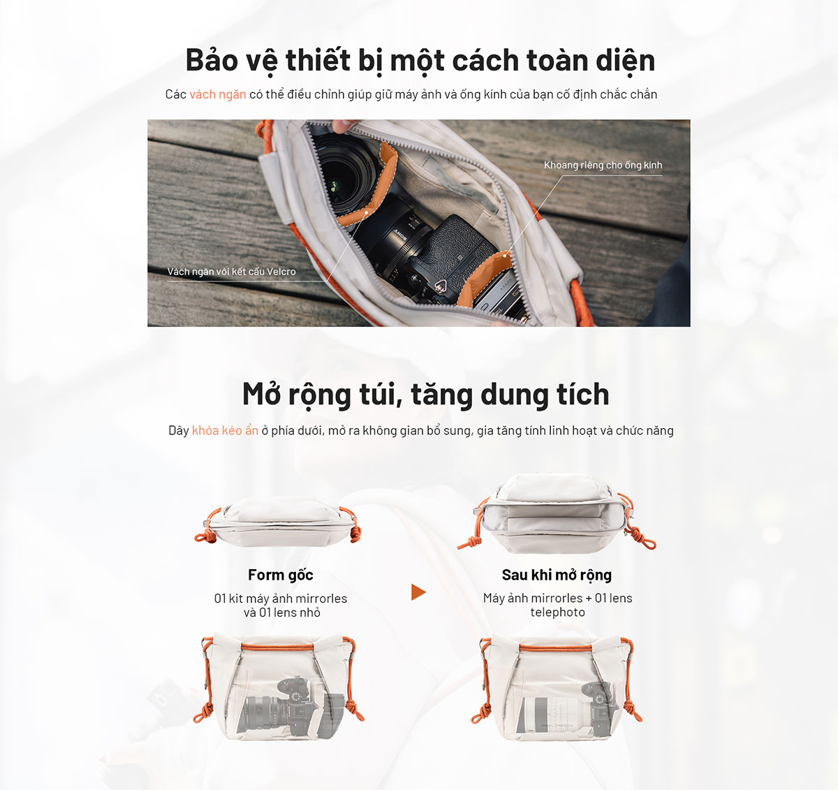 | Tương thích | 1 body + 1 lens 70-200 hoặc 1 mirrorless + 2 small lens |