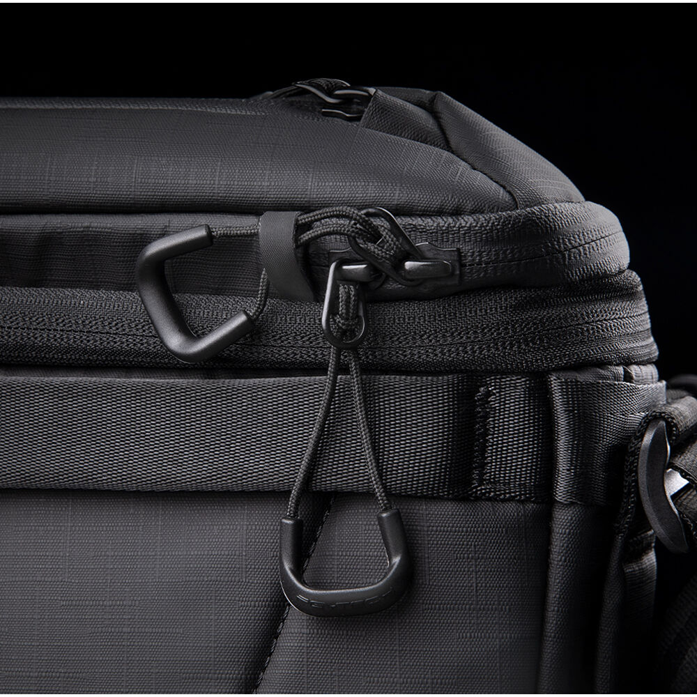 Khi mở khóa lớp ngăn giữa và kéo lên, túi có thể mở rộng sức chứa lên đến 9L, đủ chỗ cho một máy ảnh kèm ống kính 70-200mm đặt dọc, thêm một ống kính phụ và một iPad Pro 11". Dây đeo vai dày, rộng và thoáng khí đi kèm đệm vai giúp bạn mang túi thoải mái hơn. Phía dưới túi còn có dây đai gắn tripod, và hệ thống dây đeo ngoài có thể dùng để gắn thêm clip máy ảnh hoặc móc carabiner. Đặc biệt, túi còn có ngăn ẩn chứa AirTag để tăng cường khả năng chống mất trộm.