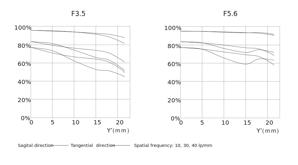 - Thiết kế apochromatic: Loại bỏ quang sai màu trục và các quang sai khác, mang lại chất lượng hình ảnh vượt trội về độ phân giải và tái tạo tương phản (tham khảo biểu đồ MTF đính kèm).
