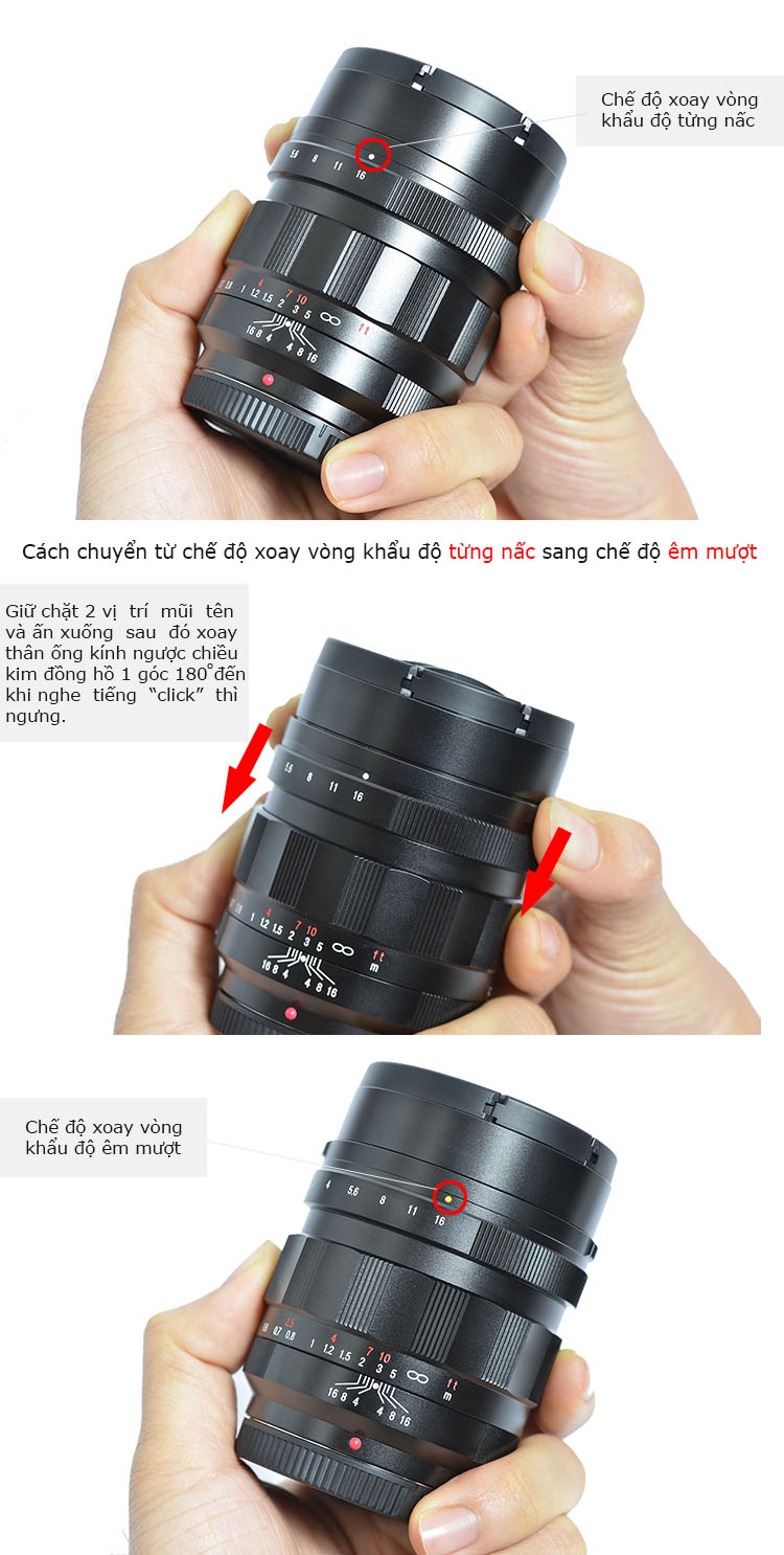 Hệ thống điều khiển vòng khẩu độ cho phép có hai tùy chọn: có thể chuyển từ chế độ xoay vòng khẩu độ với từng nấc (click) hoặc sang cách điều khiển khẩu độ vô cấp một cách yên lặng, trơn và êm mượt. Điều này thực sự lý tưởng cho ứng dụng khi quay phim, cho phép kiểm soát tốt và dễ dàng chọn khẩu độ khi ghi hình.